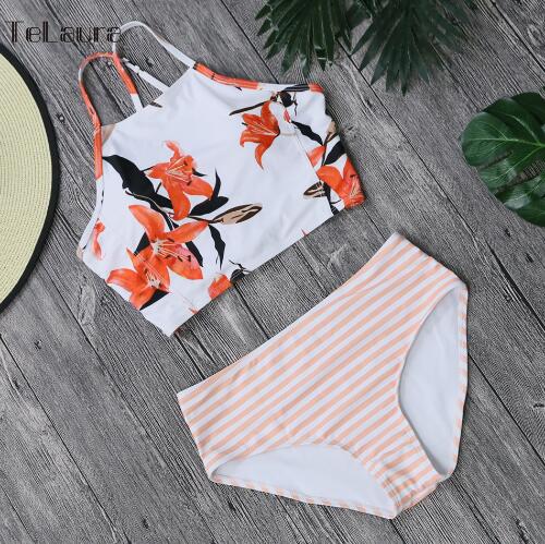 Channel effortless beach vibes with this High Neck Bikini Women Swimsuit. The top features a high-neck halter design with a vibrant floral print, offering both style and support. Paired with striped high-waisted bottoms, this swimsuit blends a fun mix of prints for a playful, chic look. Perfect for beach days or lounging by the pool, this two-piece swimsuit is designed to keep you comfortable and stylish under the sun.